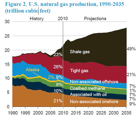 How could this possibly be? Are the EIA bureaucrats totally unaware of the shale gas revolution that is promoted so breathlessly in the op-ed columns of the world’s financial press? Well actually the EIA are all over the shale gas story as the chart below shows: