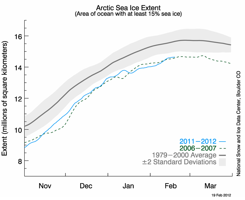 Snow and Ice Data Center shows us currently extent neck and neck with 2007. This is despite the fact that 2011/2012 saw no repeat of the arctic oscillation inversion that gave rise to Snowmageddon and Snowpocalpse over the previous two winters in the US and freezing conditions in northern Europe. So this winter, the cold air has generally stayed up north, but sea ice has still not recovered to the expected extent.