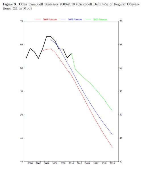 By way of contrast, the IMF highlighted the forecasts of prominent Peak Oiler Colin Campbell to represent the ‘geological camp’. It sees this as a miss as well, but in my eyes a far less spectacular one than the EIA’s: