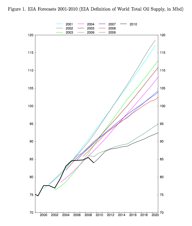 The abstract appears very even-handed in awarding merit badges to the two approaches, but if you read the body of the report I have to say that Peak Oilers have come out on top. In particular, the IMF points out that the forecasting fidelity of the major organisations making traditional oil price projections has been appalling. Here is the track record of the US government’s Energy Information Administration (EIA):