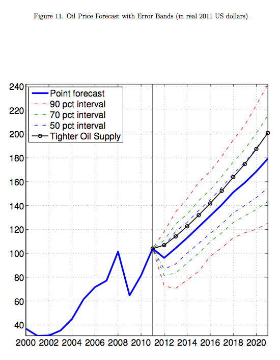 Our empirical results vindicate this choice. Our model performs far better than competing models in predicting either oil production or oil prices out of sample, in a field where predictability has historically been low. Our empirical results also indicate that, if the model’s predictions continue to be as accurate as they have been over the last decade, the future will not be easy. While our model is not as pessimistic as the pure geological view, which typically holds that binding resource constraints will lead world oil production onto an inexorable downward trend in the very near future, our prediction of small further increases in world oil production comes at the expense of a near doubling, permanently, of real oil prices over the coming decade.
