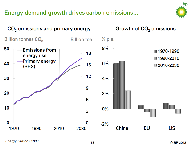 Limiting the growth of carbon emissions? Which universe is Bob Dudley occupying? According to the Energy Outlook Summary Tables (you can find them on the sidebar in an Excel spreadsheet here), coal consumption will rise by 26% from 3.7 billion to 4.7 billion toe, total liquids (including crude oil) by 17% from 4.1 billion to 4.8 billion toe and gas by 46% from 2.9 billion to 4.3 billion toe.