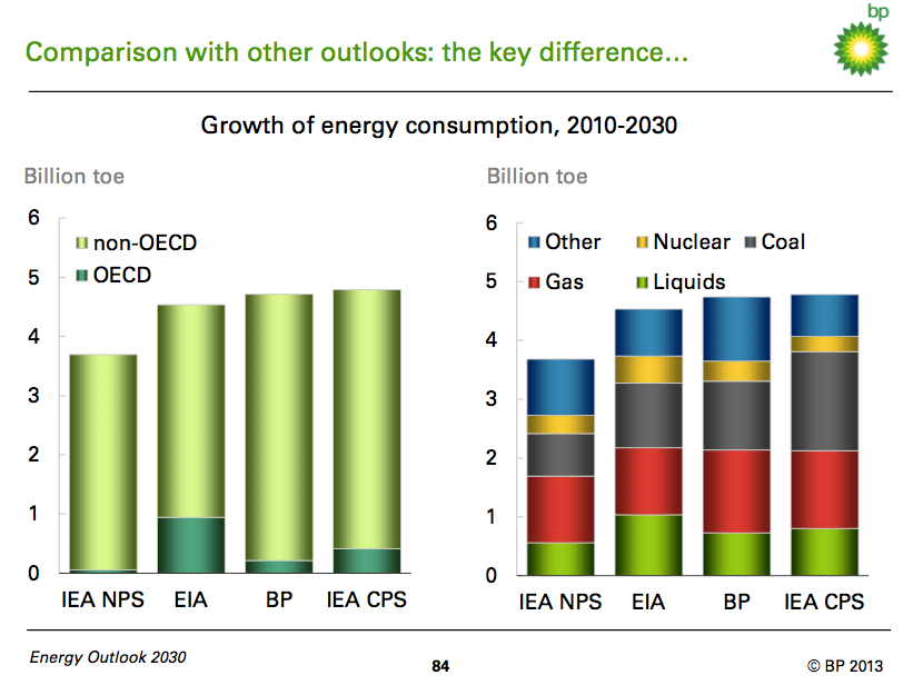 For BP, the roughly 4.5 billion toe rise in energy consumption from 2011 to 2030 is about 36% in percentage terms. Further, the increase is dominated by fossil fuels as can be seen the chart below (click for larger image):