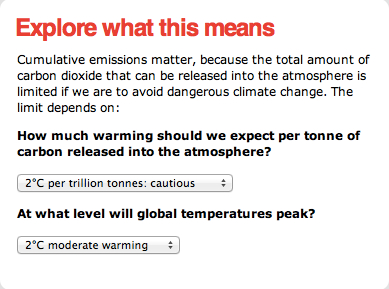 This figure is updated in real time here. You can also adjust how much warming you are prepared to accept and how sensitive you believe the climate is to the burning of each trillion tonnes of carbon: