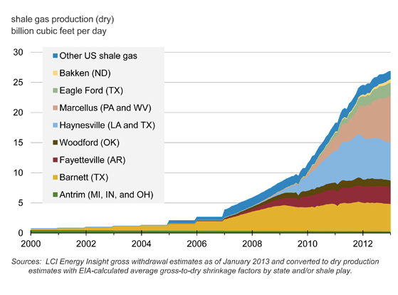 The U.S. Energy Information Administration’s Annual Energy Outlook 2013 Early Release projects U.S. natural gas production to increase from 23.0 trillion cubic feet in 2011 to 33.1 trillion cubic feet in 2040, a 44% increase. Almost all of this increase in domestic natural gas production is due to projected growth in shale gas production, which grows from 7.8 trillion cubic feet in 2011 to 16.7 trillion cubic feet in 2040.
