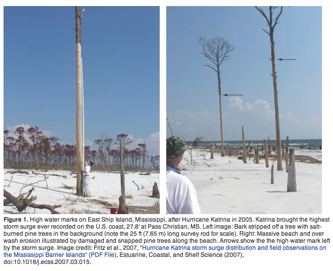 Grinstead has decided to take as his unit of measurement a Katrina-sized storm surge. While we all know that this is pretty big, the high water marks in the photos below from Master’s post (click for larger image) bring home just how amazing the storm surge was: