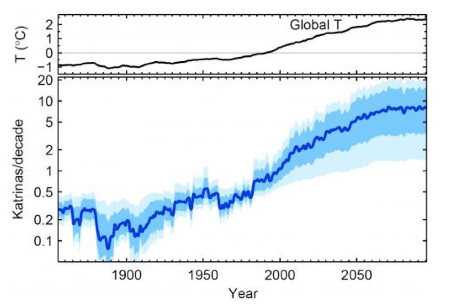 We find that 0.4 degrees Celcius warming of the climate corresponds to a doubling of the frequency of extreme storm surges like the one following Hurricane Katrina. With the global warming we have had during the 20th century, we have already crossed the threshold where more than half of all ‘Katrinas’ are due to global warming.