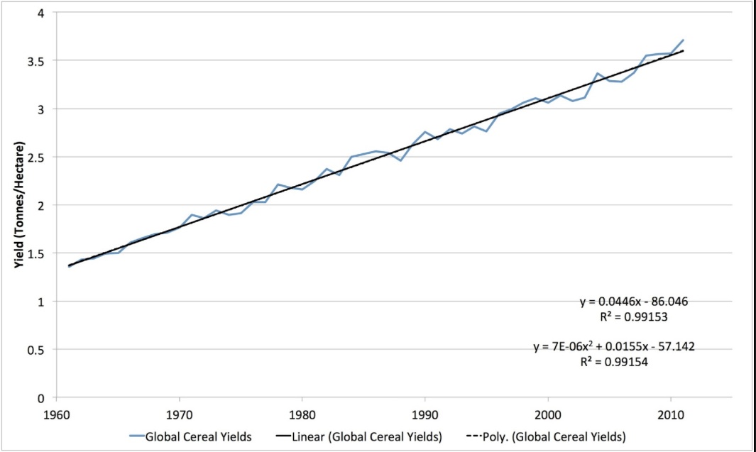 In his first post on the subject, titled “Climate Change Still Not Affecting Global Cereal Yields“, Stuart reiterates a conclusion made two years previously: