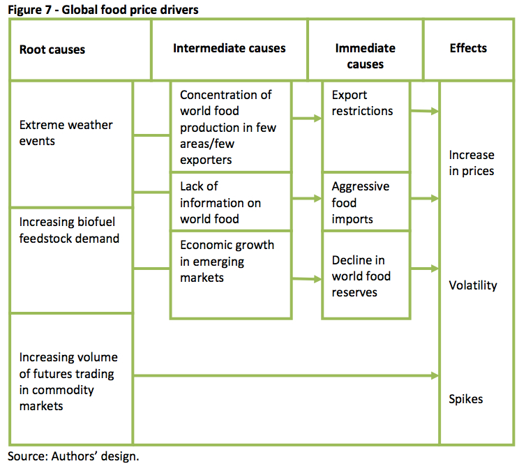 The paper actually sets out five drivers of food prices: 1) biofuel and soybean demand, 2) greater market inelasticity, 3) weather and stocks, 4) Chinese policy and 5) macroeconomic factors.