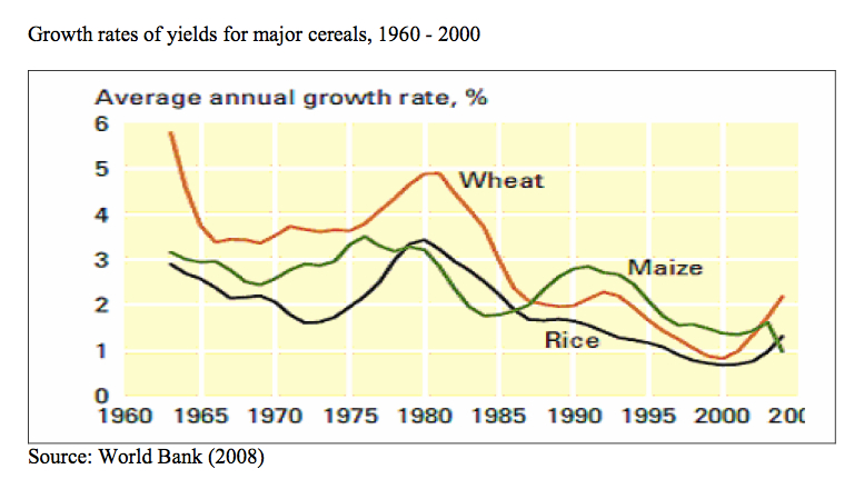 You can see the slowdown in productivity gains in this World Bank chart which the FAO reproduces here (click for larger image):