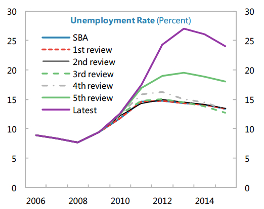 Similarly with unemployment. Back in 2009, the IMF forecast that the unemployment rate would top out at 10.9% in 2009, before a gradual improvement back into single digits in 2012. In reality, unemployment rocketed to over 24% in 2012 and is still climbing in 2013.
