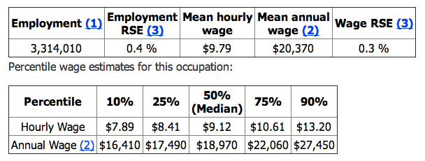 So how many cashiers can you buy for $20,000? From the US Bureau of Labor Statistic again: