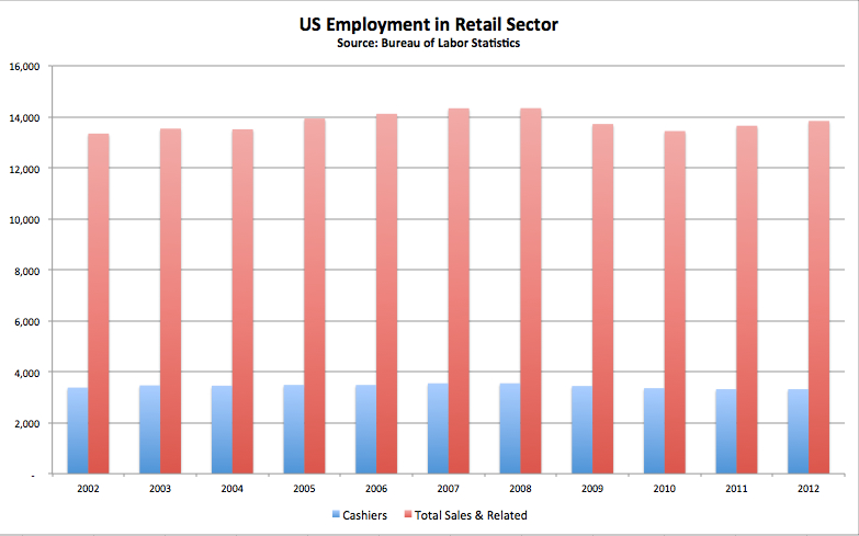 Total employment in the Sales and Related sector grew 3.7% from 2002 to 2012 to reach 13.8 million, with a noticeable downward blip over the Great Recession. Employment for cashiers, however, declined by 1.8% to 3.3 million, with no bounce back after the Great Recession. Why the difference? Well, my guess is that the difference is because of these:
