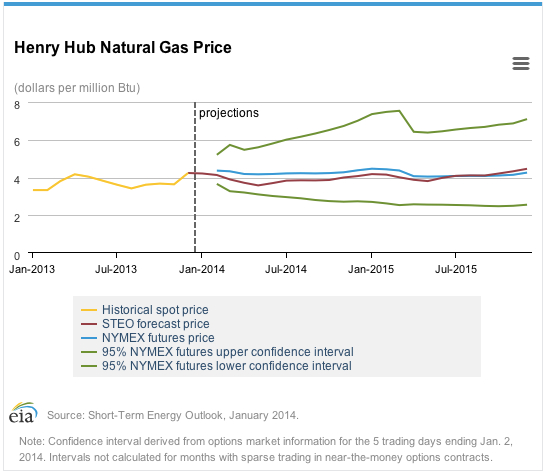 The EIA also sees little change in price or volume of production going forward. The agency’s latest “Short-Term Energy Outlook” (STEO) was issued on January 7th and contains new forecasts going out until end 2015. According to their numbers, the Henry Hub price is to remain flat for the next two years at around $4, while production will increase 2.1% in 2014 and 1.3% in 2015 (click for larger images for the charts below).