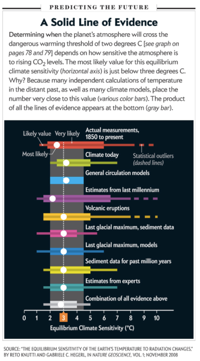 It gets worse. What if their climate sensitivity numbers are wrong. Curry and Lewis use one particular approach to reach their figures, but there are others. Michael Mann sets out the alternative approaches and the resulting climate sensitivity numbers in a Scientific American article here (click for larger image). In general, they are nearly all higher than those of Curry and Lewis. So Curry and Lewis’ disastrous climate change tail risk, with odds perhaps measured in the hundreds, may actually be a tail risk with odds measured in the tens. We can’t really be sure at this stage.