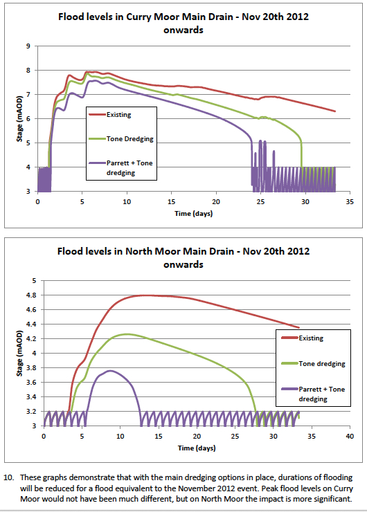 The charts show a far quicker recovery from flooding events after theoretical dredging, although in the case of Curry Moor the peak flood level is very similar before and after the dredging.