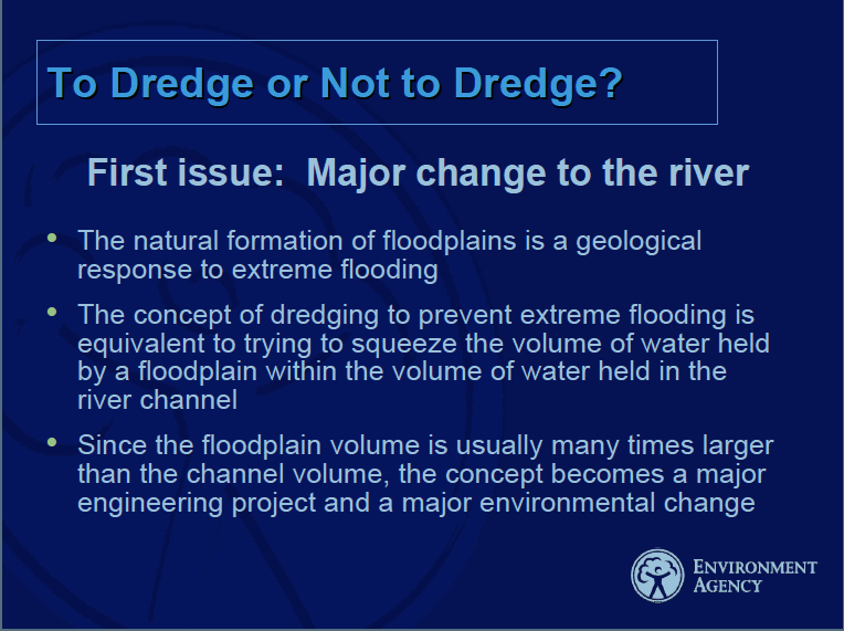 The Environment Agency then goes on to point out that if you want to keep water off the floodplain then you would need to both deepen and widen river channels and repeat dredging at regular intervals to prevent silting. This all costs money, but it can be done.