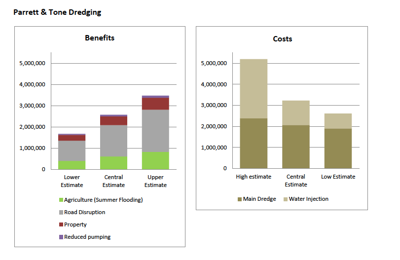 The media frequently reports a benefit-to-cost ratio of eight as the hurdle rate for flood projects to go ahead, but, as the table above shows, the methodology is more complex than that. Nonetheless, only three of the six projects that would have been eligible for flood defence grant in aid—the ones which had partnership funding scores above 100%. These three had benefit-to-cost ratios of 7.23, 8.14 and 4.68, respectively. The Parrett and Tone dredging scheme can’t get anywhere close to these numbers.