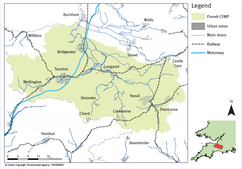 Moreover, we don’t have access to FLAG’s data, but we do have access to rainfall records via the Met Office for the nearby Yeovilton weather station. Yeovilton is approximately 18 miles away from Burrowbridge, which is in turn in the heart of the Parrett/Tone area and the site of the bridge photoed above. Yeovilton is also 5 miles north of Yeovil in the Environment Agency map below (although not marked) and firmly inside the Parrett Catchment Flood Management Plan (CFMP).
