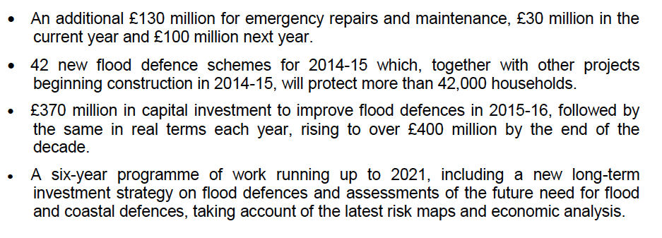 In short, David Cameron, who has just announced the recommencement of dredging on the Somerset Levels, has thrown Treasury benefit-to-cost ratio guidance out the window due to the political fallout from the floods. I doubt, however, that this ad hoc response will translate into the longer term promotion of flood defence projects with low BCR ratios. Why should flood defences be treated differently from cancer wards, kindergarden places, pedestrian crossings or pollution control? And given that the Treasury has a hard budget restraint, my belief is that they won’t be once the political hullabaloo has subsided.