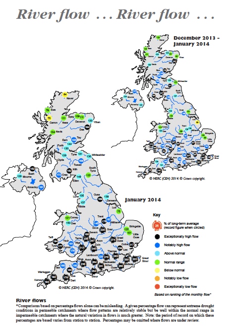 The black circles indicate exceptionally high flow, and the arrows a new record. So the Thames, for example, recorded a flow 263% above the long-term average in January (you may need to follow the link to the monthly report to see this clearly).