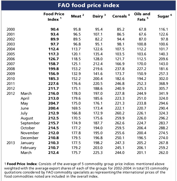 At the beginning of each month, the Food and Agriculture Organisation of the United Nations (FAO) releases a series of price indices for a variety of food commodities (here). The headline FAO Food Price Index is a composite of five food groupings: meat, dairy, cereals, oils and fats and sugar. The base 100 is the indexed averaged price for the 2002-2004 period. The March 2013 index number was released on April 11th. Key points are as follows: