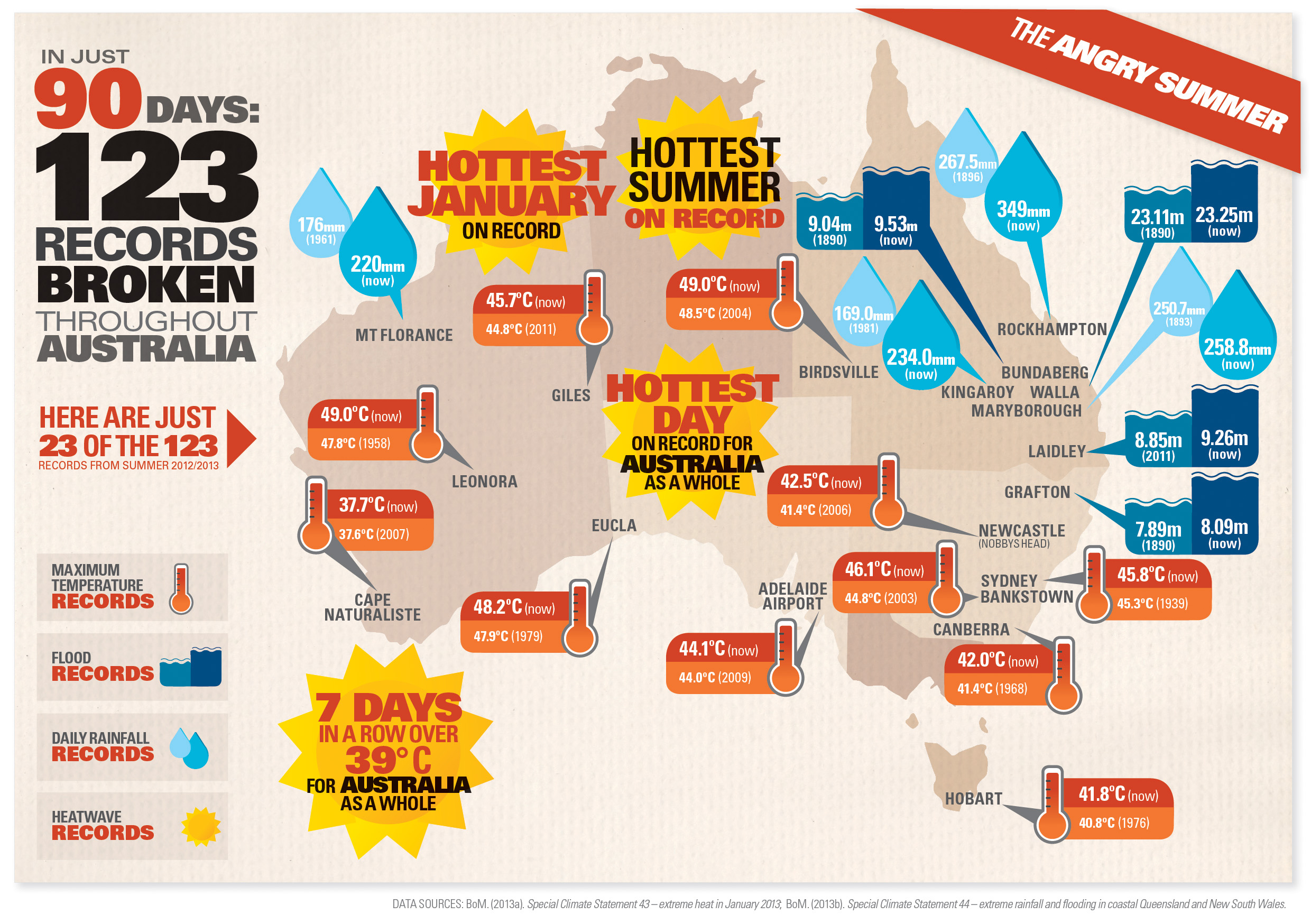 The Climate Commission of Australia has done some wonderful work highlighting the extraordinary nature of last summer’s weather within the context of climate change. The full report, called the Angry Summer, contains some great graphics such as this (click for larger image):