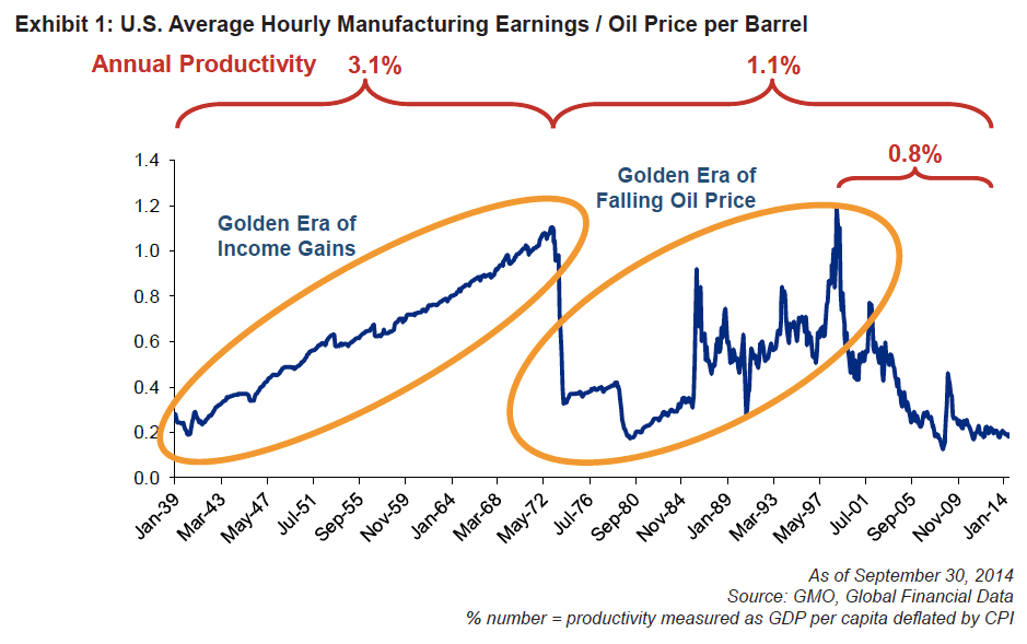 Grantham points out that in 1940 one hour’s work for an American engaged in manufacturing could buy 20% 0f a barrel of oil. At the twin peaks of oil abundance–1972 and 1999–the same wage could buy over a barrel of oil. But those days, he argues, are long gone. According to Grantham, this has implications for not only oil markets but also for the energy underpinnings of global economic and productivity growth.