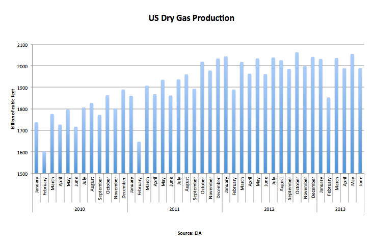 The rapid deceleration in natural gas production growth has led to an uptick in prices over the last 12 months. Prices paid by electricity utilities have now reverted to between $4 and $5 dollars per thousand cubic feet from a low of less than $3 in April 2012. At some stage, rising prices should lead to a further investment in shale gas production, but this has yet to be seen.