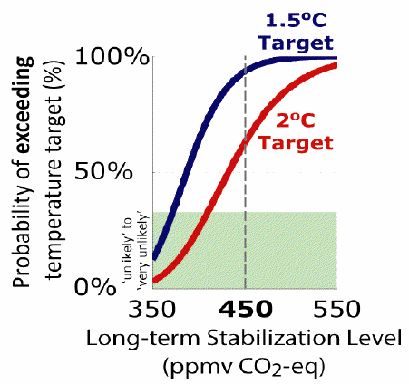 Stabilisation at 450 ppm CO2 equivalent would only limi warming to 2°C if the climate sensitivity to a doubling of CO2 were 3°C or lower. However, as the IPCC AR4 found, the climate sensitivity is quite uncertain, and whilst IPCC’s best estimate is 3°C there is roughly a 50:50 chance that it is actually higher. Taking into account this uncertainty, global warming may well exceed 2°C for stabilisation at 450 ppm CO2 equivalent.