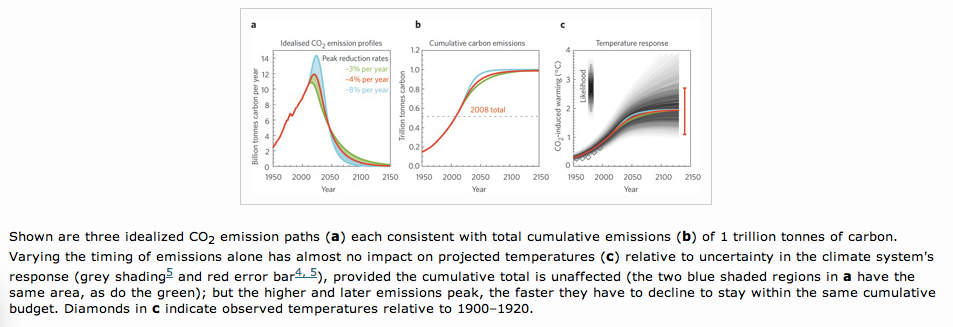 Using the year 2000 as a base year, the paper calculated that 1,000 Gt CO2 could be released between 2000 and 2050 such that there was only a 25% chance of missing the 2 degree target—or, put another way, a 75% chance of achieving the target. (After 2050, the paper assumed that CO2 emissions would by then be negligible and compensated for by land-use related CO2 absorption.) For the 50% figure (a more risky bet), they arrived at a larger budget of 1,440 Gt CO2.