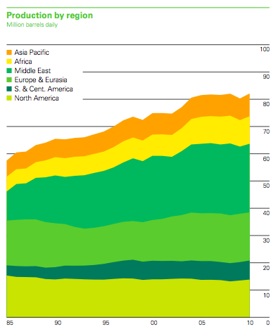 The market speaks—and it is stunning reaffirmation of Campbell and Laharrere. Yergin’s book “The Quest” is a paean to technology: data processing on an unheard of scale, horizontal drilling, CAD/CAM oil field design, deep water drilling, new technology to extract oil from tar sands and shale—the list goes on. In other words, the modern world oil industry is a tribute to science, as well as man’s endeavour unleashed by free markets. Yet over that period the oil price has risen tenfold in nominal terms and over fivefold in real, inflation-adjusted terms. And here is the supply response (taken from the BP Statistical Review). Lacklustre at best.