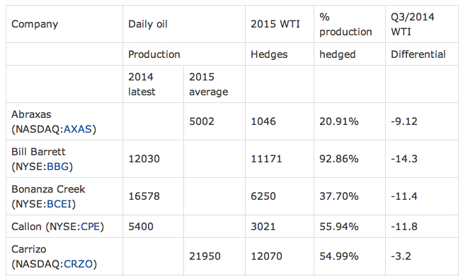 How long will it take for production to adjust if crude stays around $50 per barrel? As I’ve mentioned before, shale is an industry with high upfront costs but relatively low operating and maintenance costs. The upfront costs are already ‘sunk’, so the ‘pump’ or ‘don’t pump’ break-even point is as low as $10-20 per barrel. Moreover, many producers hedge to varying degrees. To get a taste of this, here is part of a table on listed shale oil producers published at Seeking Alpha.