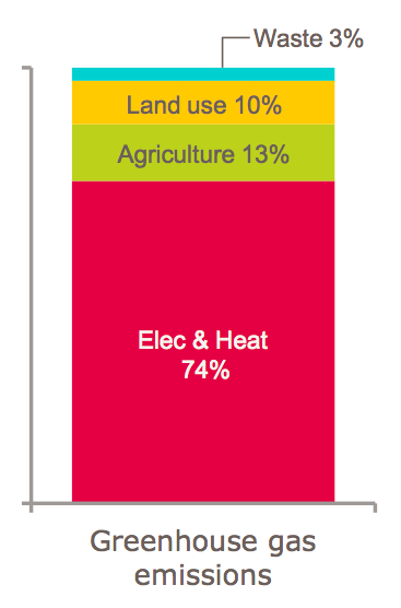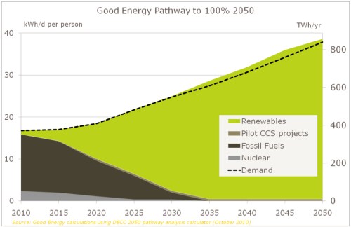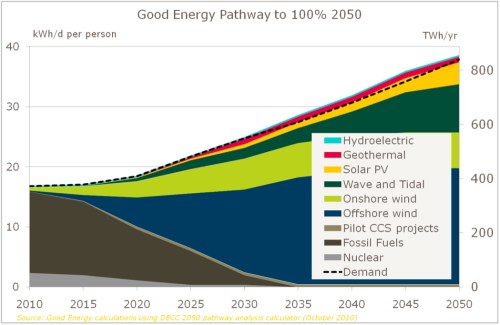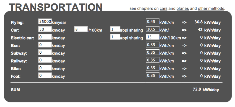 He starts by calculating that “the average raw power of sunshine per square metre of flat ground (in the UK) is roughly 100 W/m2″. However, with a 10% efficiency photovoltaic panel, of the 100 W/m2 only 10 W/m2 is converted into electricity. From my last post we also know that if we leave a 40W light bulb on all day, it will use up nearly 1 kWh of power (0.04kW times 24). So if we generate 10 W per a one metre squared solar panel, we will get a quarter of that in energy, or 0.25 kWh. MacKay in his calculation has allocated 5% of the UK’s land mass to be used for solar power, which gives 200 m2 to each UK citizen. Times 200 by 0.25 kWh and we get 50 kWh per person per day, which compares with total energy demand of 125 kWh per person per day.