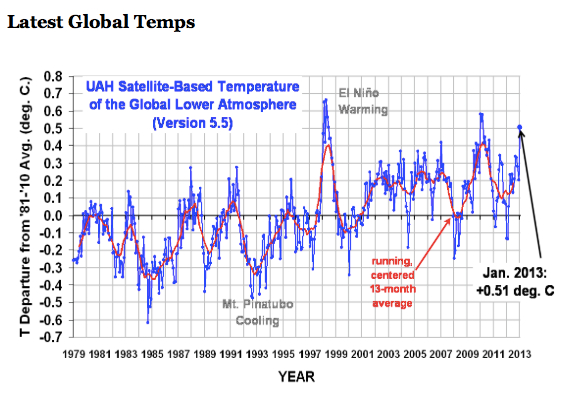 Spencer, and his colleague John Christy at UAH, are noted climate skeptics. They are also highly qualified climate scientists, who believe that natural climate variability accounts for most of recent warming. If they are correct, then we should see some flattening or even reversal of the upward trend within the UAH temperature time series. To date, we haven’t (click for larger image).