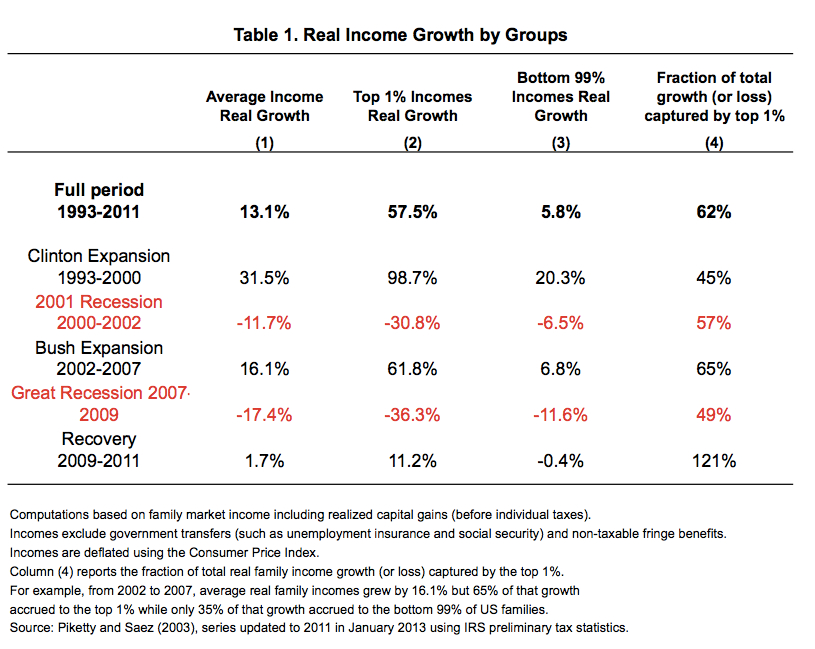 This sounds all very Marxist, but a recent paper by Emmanuel Saez of the University of California shows the amazing extent to which top earners in the U.S. are taking an accelerating share of total income. True, the Great Recession saw a short hiccup in this trend, but the bounce-back since then has been extraordinary: all the gain has been captured by the top one percent (click for larger image).