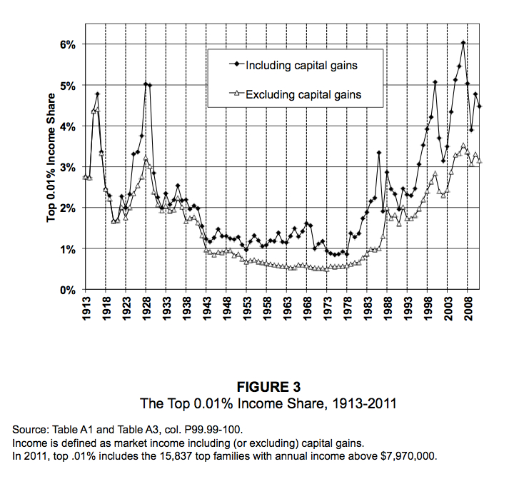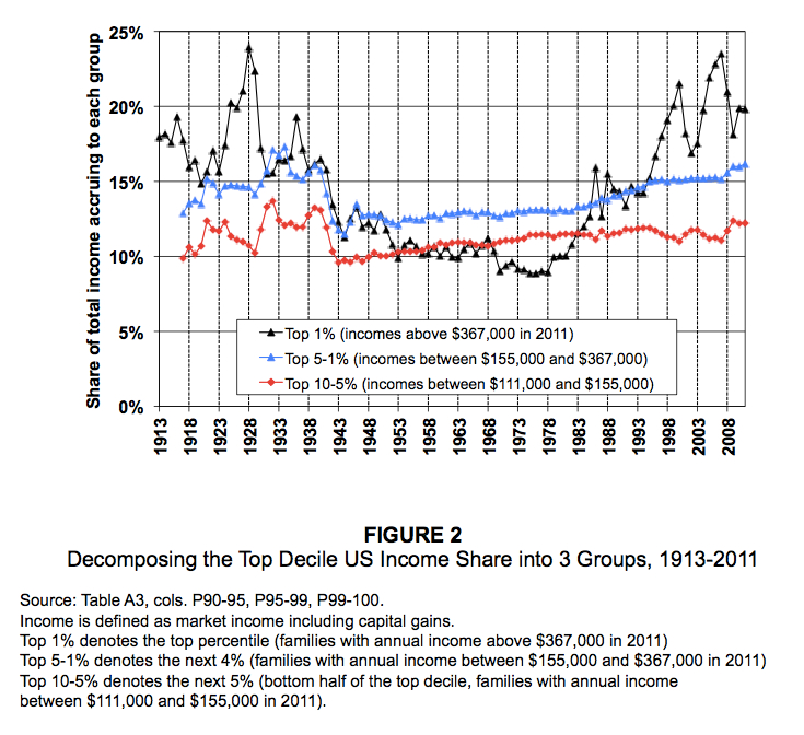 Saez also puts current income concentration in the context of the historical trends since 1917. As things stand, the rich (top 10%) are pulling away from their 1920s equivalents let alone the average household of the post-war period.