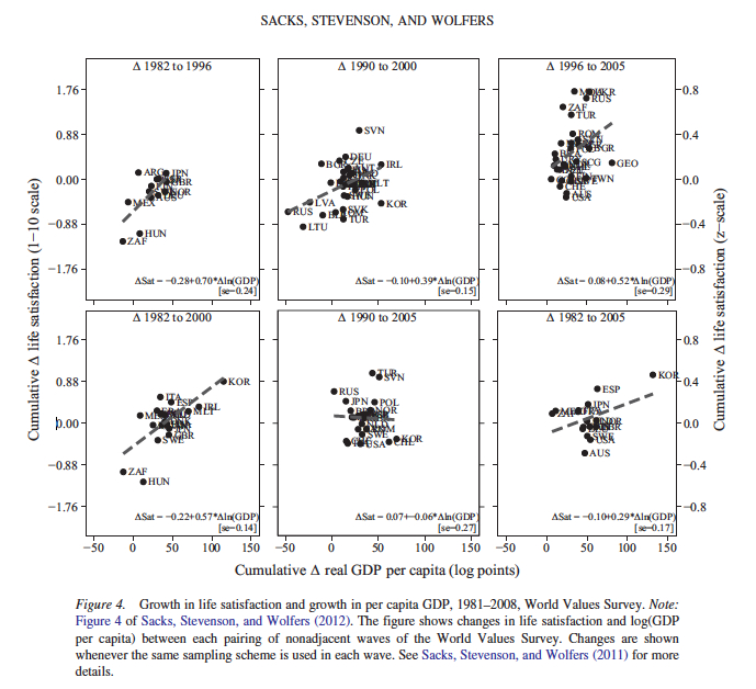 In my last post (here), I looked at the mounting evidence that GDP per head is correlated with happiness when tracked for individual countries through time—a finding that goes against the previous orthodoxy that went under the moniker of the Easterlin Paradox (if we all get richer, none of us get happier).