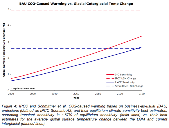 Please note though that A1B in its early years is not really a ‘balanced technology’ path as the renewables build-out has yet to take place. And, as noted before, because of some idiosyncrasies between the A1B and A1FI models, we are currently above the fossil fuel intensive A1FI path.