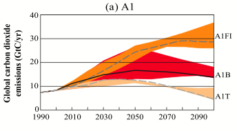 Against this background, fossil fuel emissions to date don’t really help us much in deciding whether we will end up following the A1B balanced technology path or the A1FI fossil fuel intensive path.