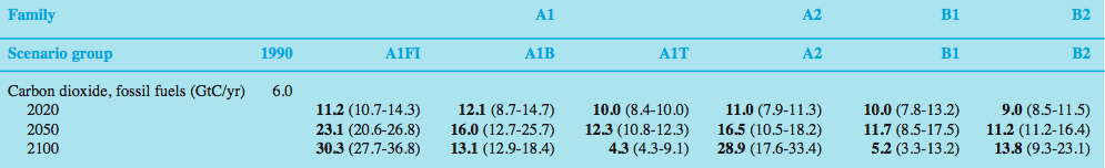 More important, the A1FI (the top dotted line) and A1B (the thick line) scenarios part company around 2020, with CO2 emission levelling off for the latter as wind, solar and such like comes on stream in mass. Looking at the predicted CO2 emission in 2050, we can see the divergence quite starkly in the table below (click for larger image).