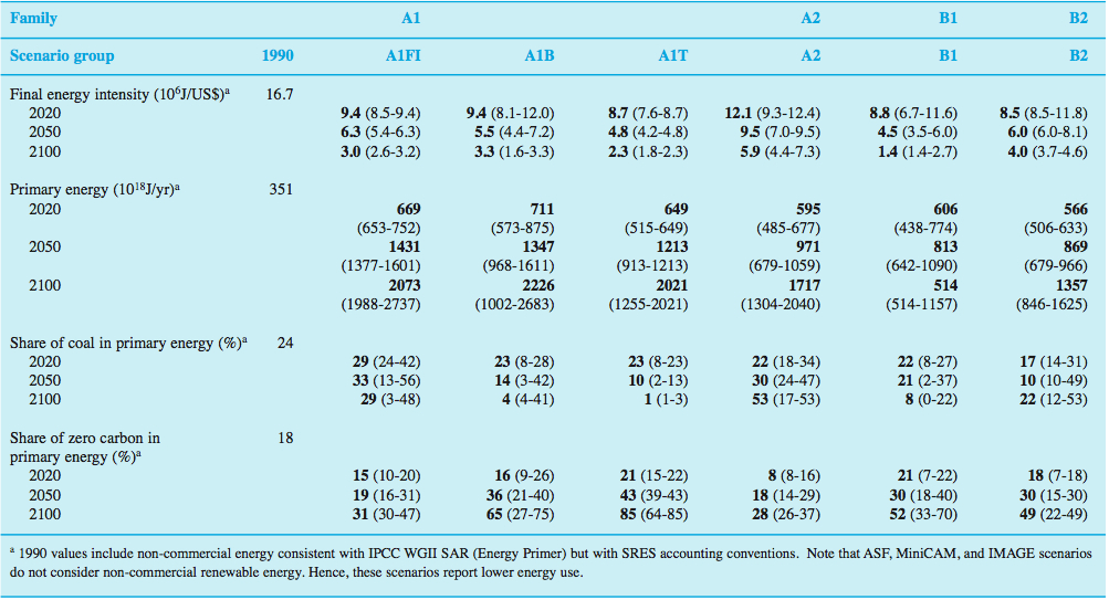 In a similar manner, the table below (again click for larger image) shows an emerging difference between A1FI and A1B with respect to the reliance on coal and introduction of zero carbon renewables between 2020 and 2050: