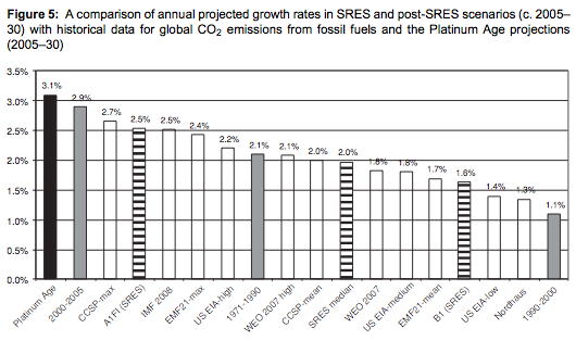 The IPCC sees emissions peaking under A1B at around 60 Gt somewhere around 2050, which is about double the current level of annual fossil fuel emissions. Others are less sanguine. Ross Garnaut, the well-know Australian economist published a paper (here) that suggests emission growth rates will outstrip even the IPCC’s A1FI scenario: