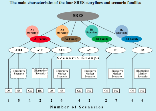 The four storylines are then further subdivided into more scenarios. Branching out from A1 are the three scenarios A1FI, A1B and A1T. The first is a fossil fuel intensive growth scenario, the second a balanced fossil fuel/renewable scenario and the last a renewables heavy scenario.