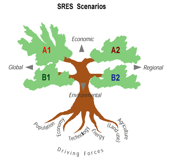 The A1B scenario came out of a report entitled the Special Report on Emissions Scenarios (SRES) published by the Intergovernmental Panel on Climate Change (IPCC) in 2000. These SRES scenarios formed the basis of the IPCC’s Third Assessment Report (TAR) published the same year and were also used for the Fourth Assessment Report (AR4) published in 2007. In reality, the scenarios are thought exercises. In the IPCC’s words: