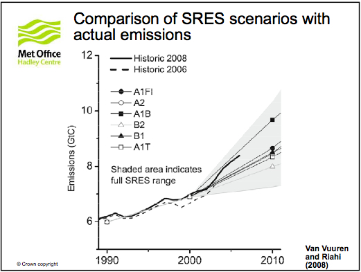 So the projections given by the Met Office are premised on the world following the A1B emissions scenario; if the world doesn’t follow this scenario, the Met Office’s projections are invalid.
