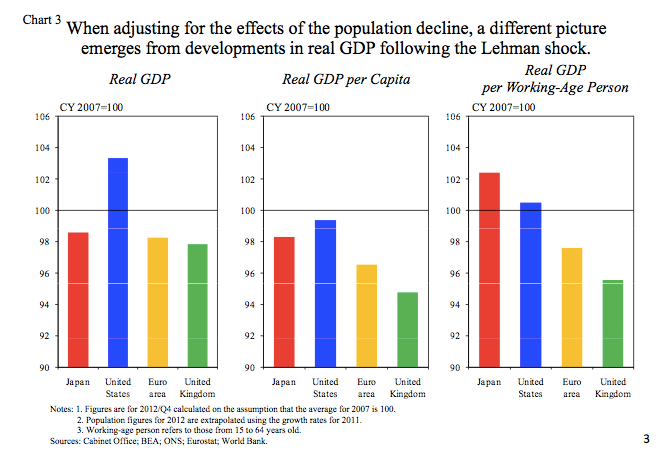 This, of course, is a bubble meister’s charter, since for Kuroda to succeed in changing consumer expectations he must keep the accelerator pedal depressed for years. It is also worth keeping in mind that the Bank of Japan’s newly minted 2% inflation target is only an intermediate goal. As I explained in my last post, what monetary policy is really trying to achieve here is the closure of an output gap, i.e., the difference between where the economy is currently operating and where it could be operating if labour and capital were fully employed.