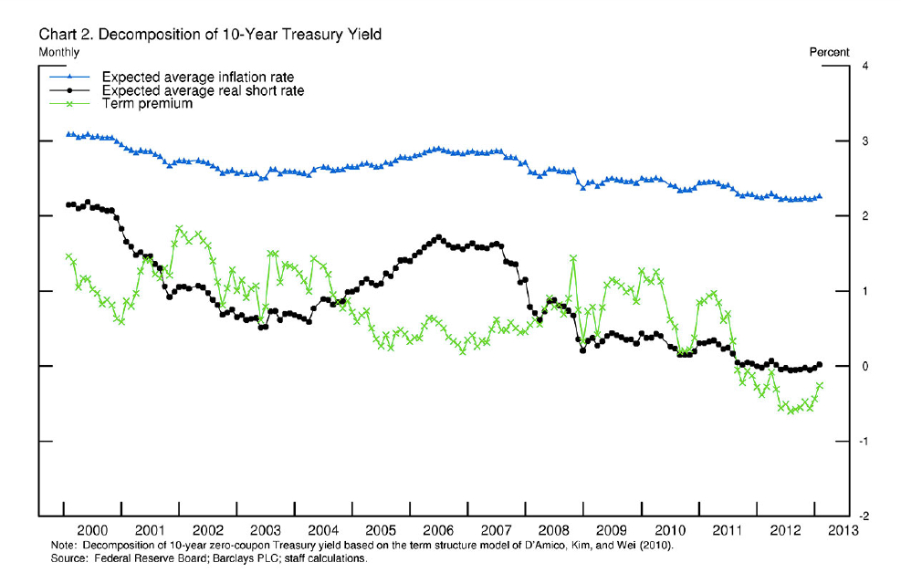 Note that the expected average short-term real interest rate has come down from around 2% in the year 2000 to essentially zero now. And what does this mean in economic terms. Bernanke provides the answer: