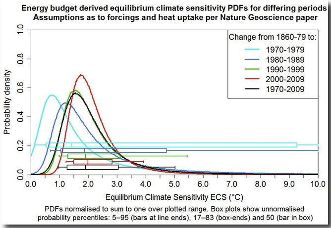 Lewis has also helpfully produced a graphic showing the climate sensitivity estimates based on various observational periods (as to why he is putting this onto the climate skeptic blogs Bishop Hill and Watts Up With That I can’t quite fathom):