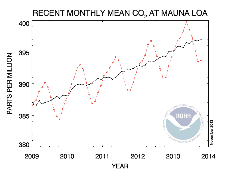 Note: the slight differences between the anomalies recorded by the two US government agencies, NOAA and NASA, are due to different measurement procedures. Nonetheless, for both time series, the years from the last decade dominate the table and broadly align. And for 2014?